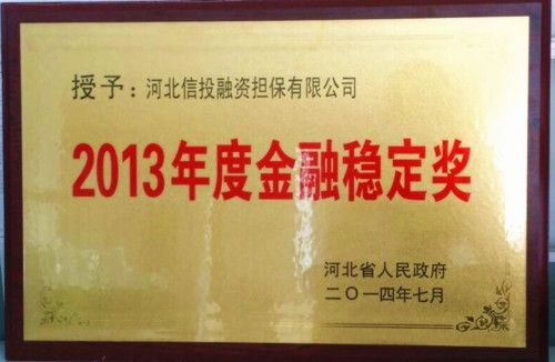 根据《河北省人民政府办公厅关于2013年度金融贡献奖考核评选结果的通报》,河北信投融资担保有限公司(以下简称信投担保公司)荣获 2013年度“金融稳定奖”。这是信投担保公司继2012年荣获省政府“金融创新奖”后,再次被省政府表彰。
